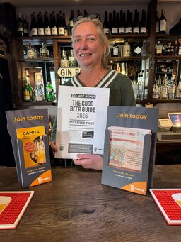 (Above Centre)The Landlady Antonia of the Kings Arms in Rotherfield is seen proudly showing her Good Beer Guide 2026 Licensee Pack