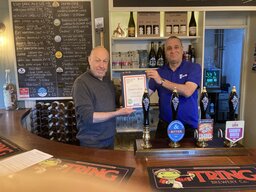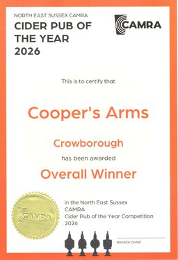 Cider PotY 2026 Winner Friday 3 April 2026 Coopers Arms Crowborough on 03/04/26 and shows the branch presenting the award to Dave the pub owner